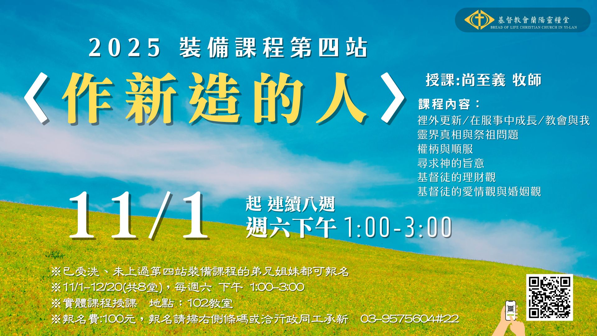 5.教會裝備課程第四站「作新造的人」即將開課,上課時間:11/1起連續8週(11/1~12/20),每週六下午一點至三點,凡已受洗、未上過第四站裝備課程的弟兄姊妹皆可報名,費用100元,報名請掃條碼填寫資料或洽行政同工承新。
